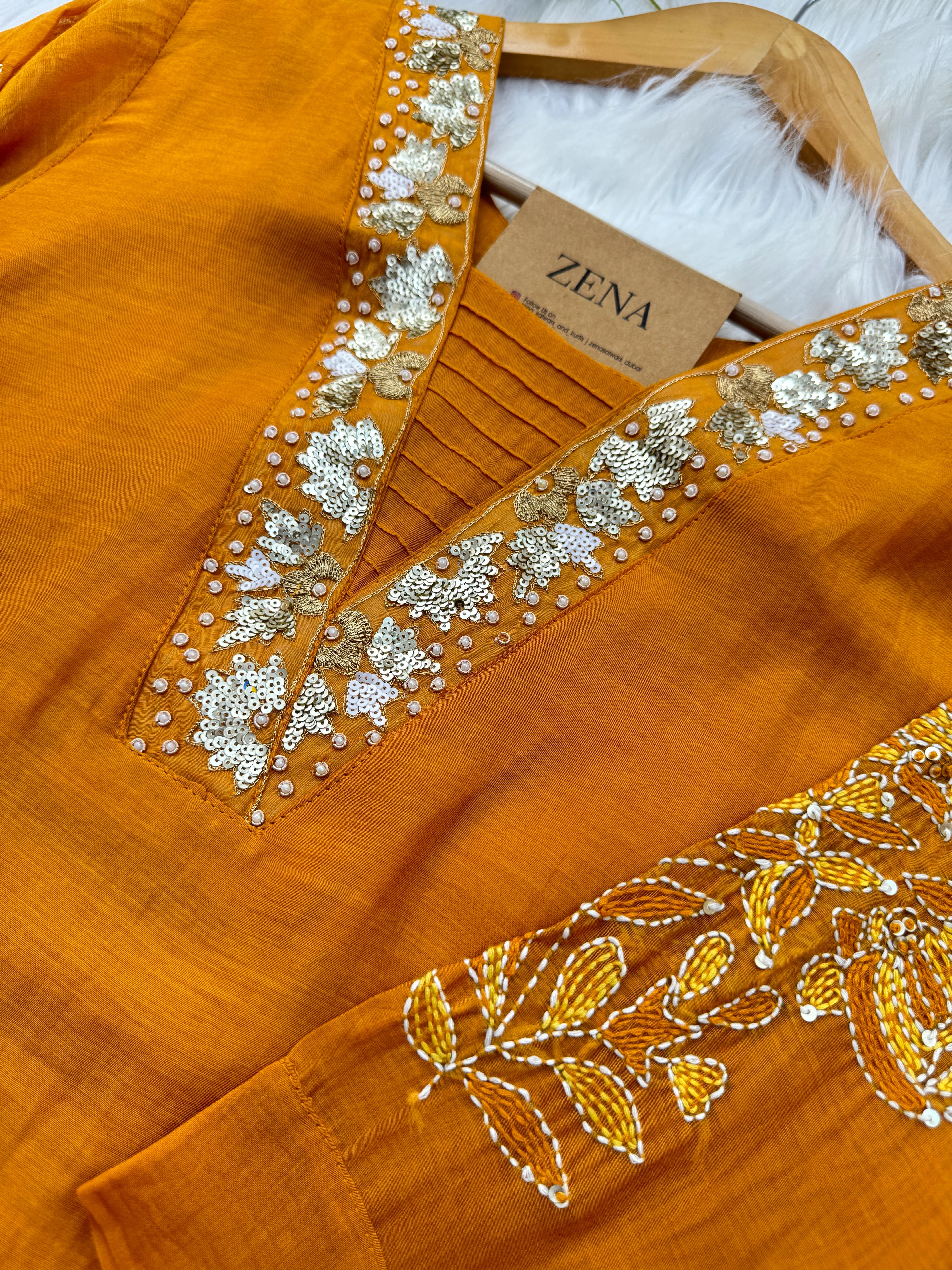 Premium Mul Chanderi Hand Detailed A-Line Kurti Set – Grace in Every Thread