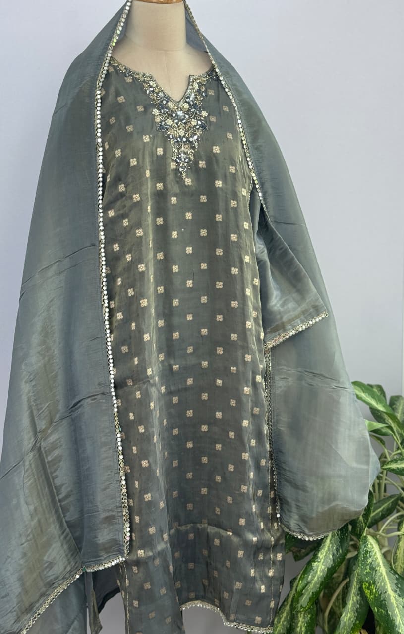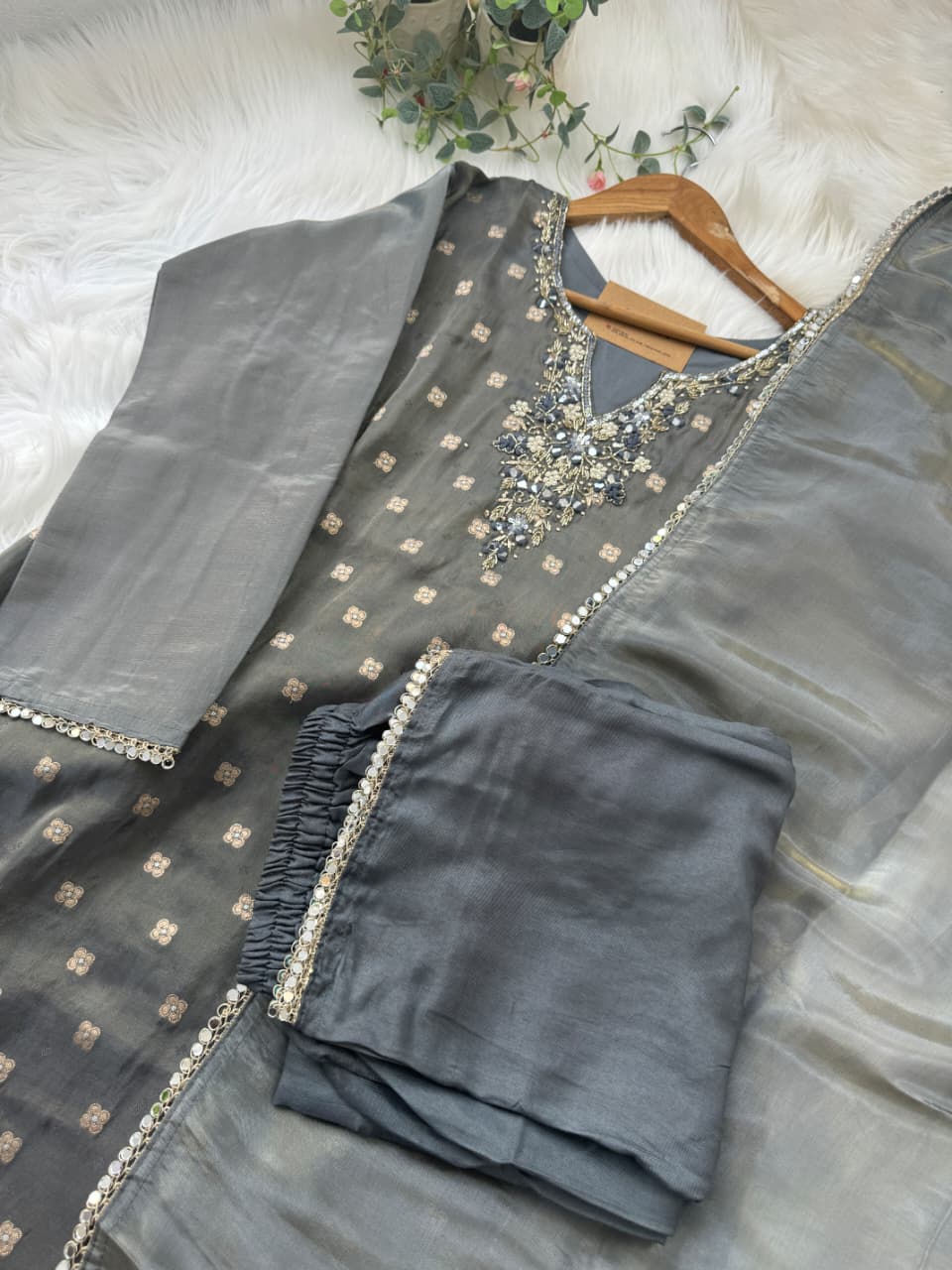Step into sophistication with our Premium Tissue Silk Hand Work Suit, crafted to exude timeless grace and luxury. Made from fine Tissue Silk fabric, this ensemble features exquisite hand work detailing that adds richness and charm to your festive wardrobe. The fabric’s subtle sheen, lightweight texture, and smooth finish make it an ideal choice for special occasions.