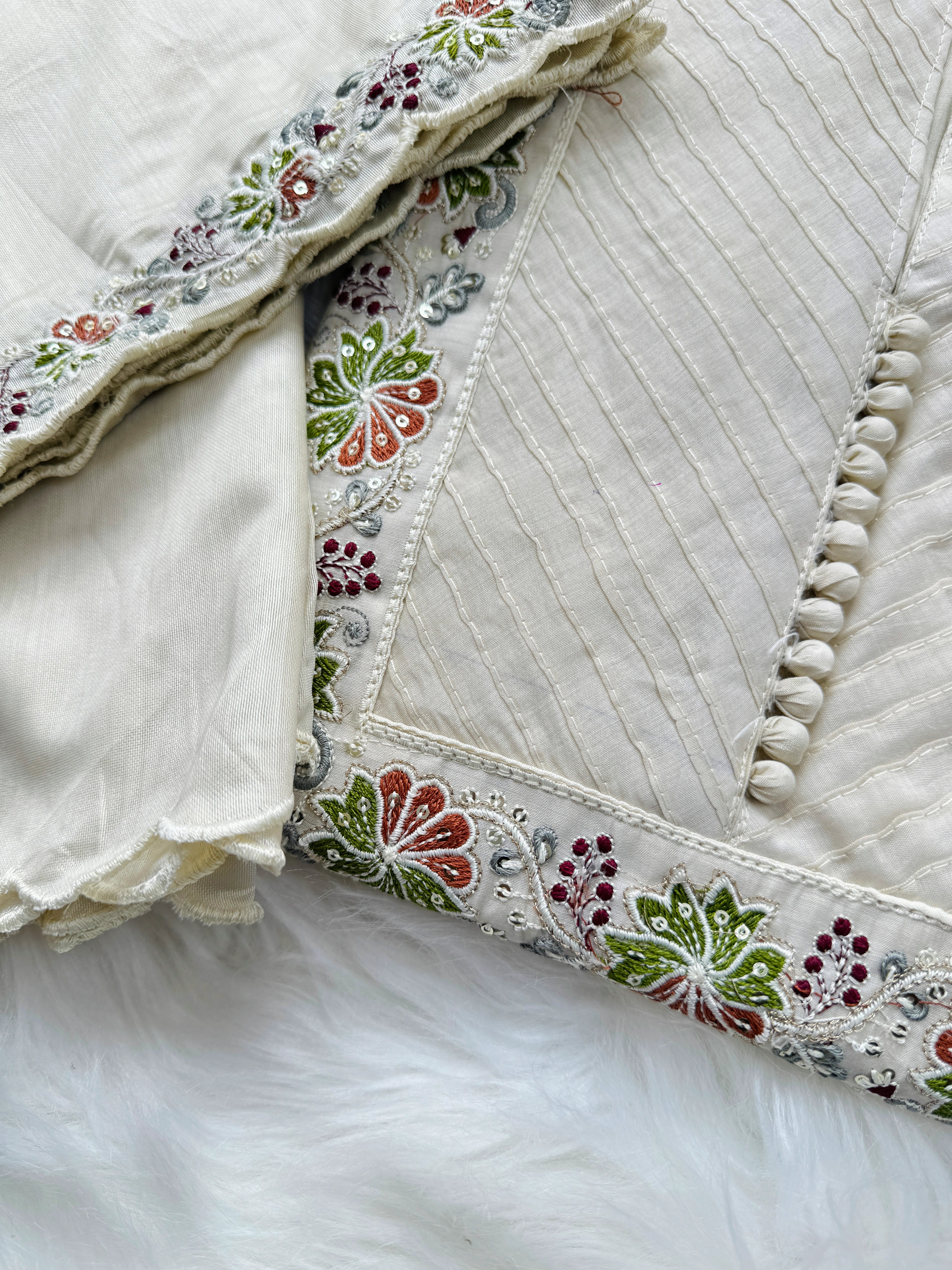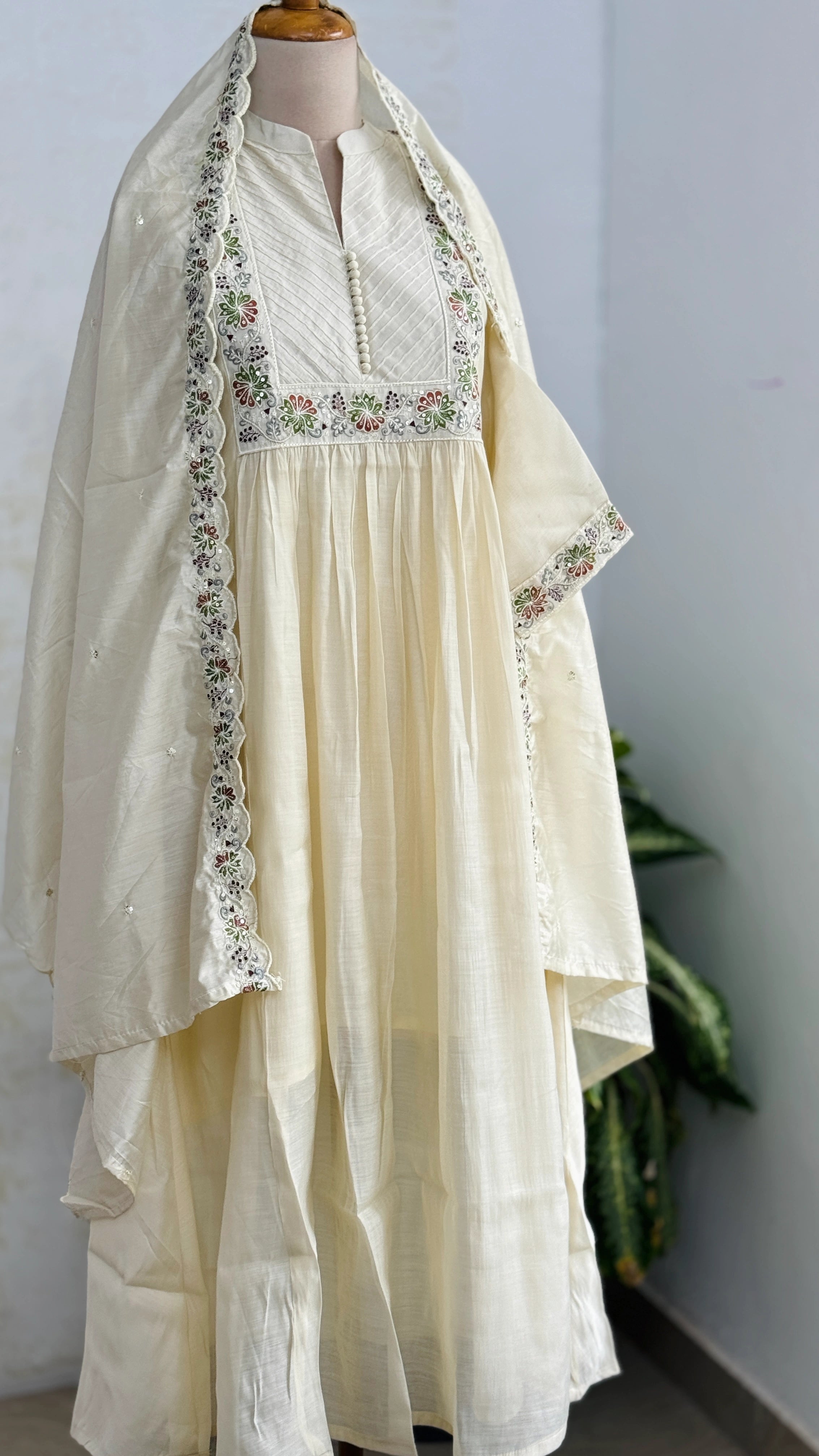 Embrace timeless elegance with this Premium Mul Chanderi Embroidered Anarkali Suit, designed for a graceful and flattering silhouette. Crafted from lightweight mul chanderi fabric and adorned with delicate embroidery, this suit offers a perfect blend of comfort and festive charm.