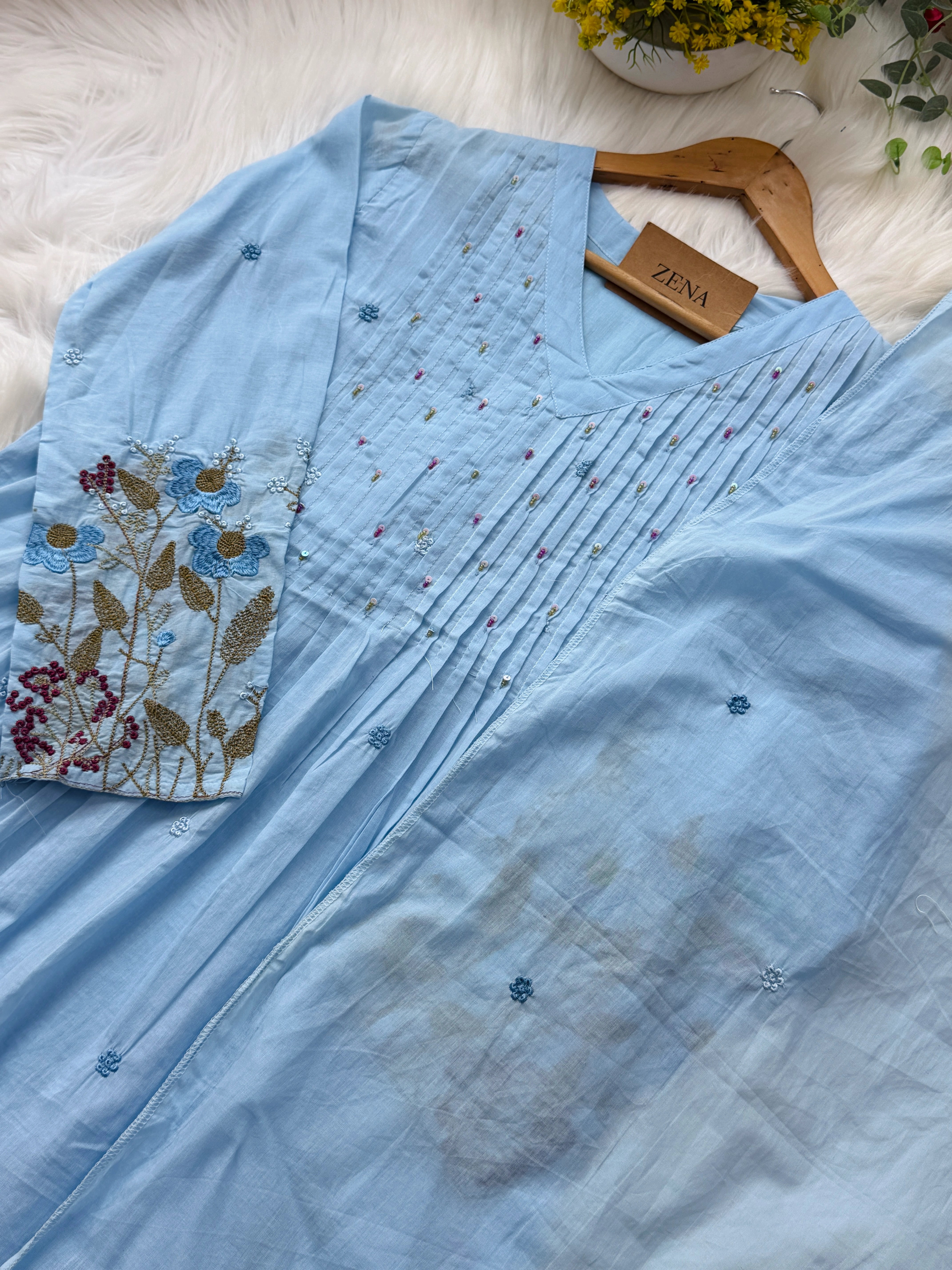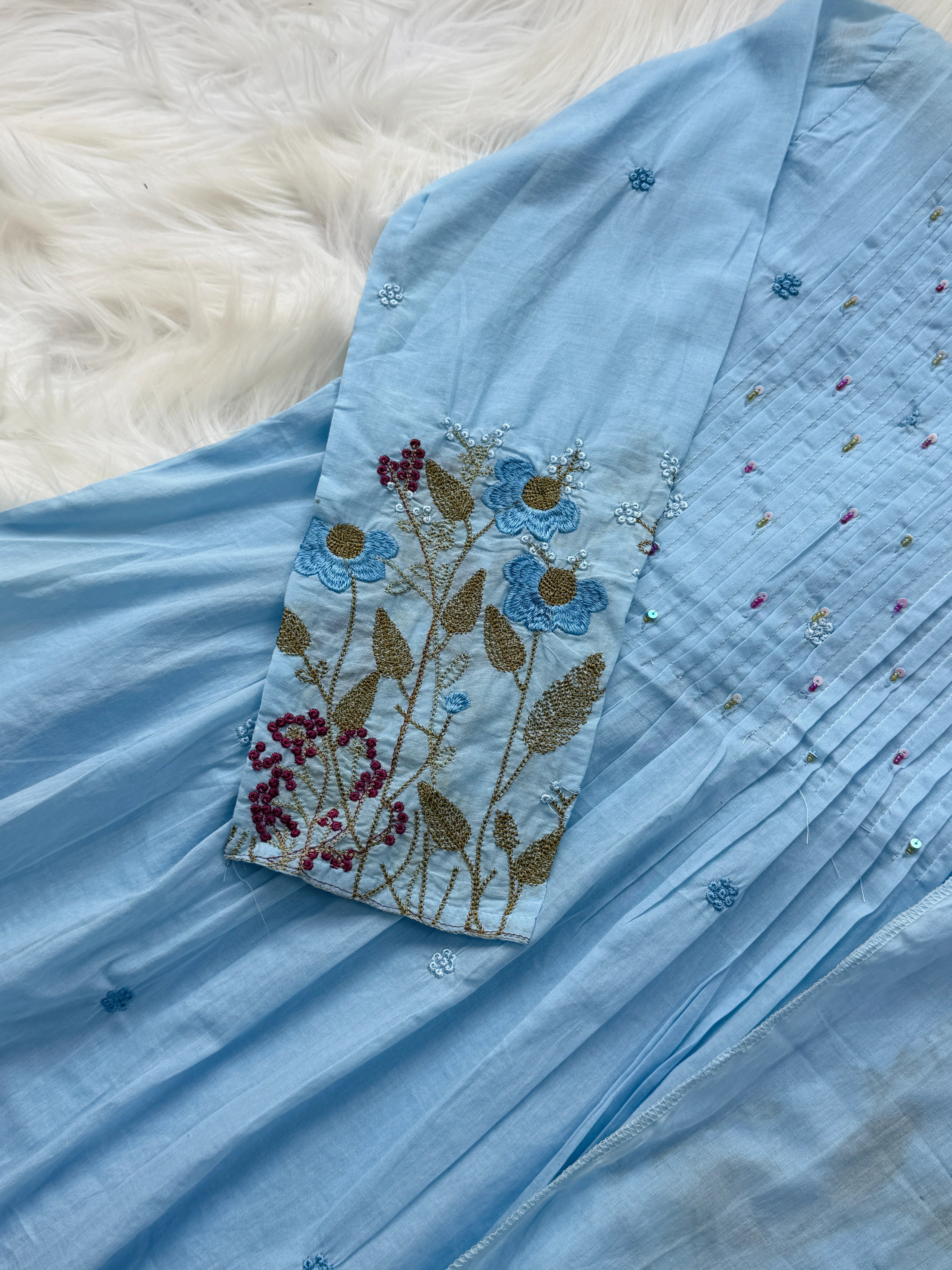 The delicate hand-detailed work adds a unique artisanal charm, while the graceful Anarkali silhouette creates a flattering and flowy look. Ideal for festive occasions, family gatherings, office wear, and elegant everyday styling.