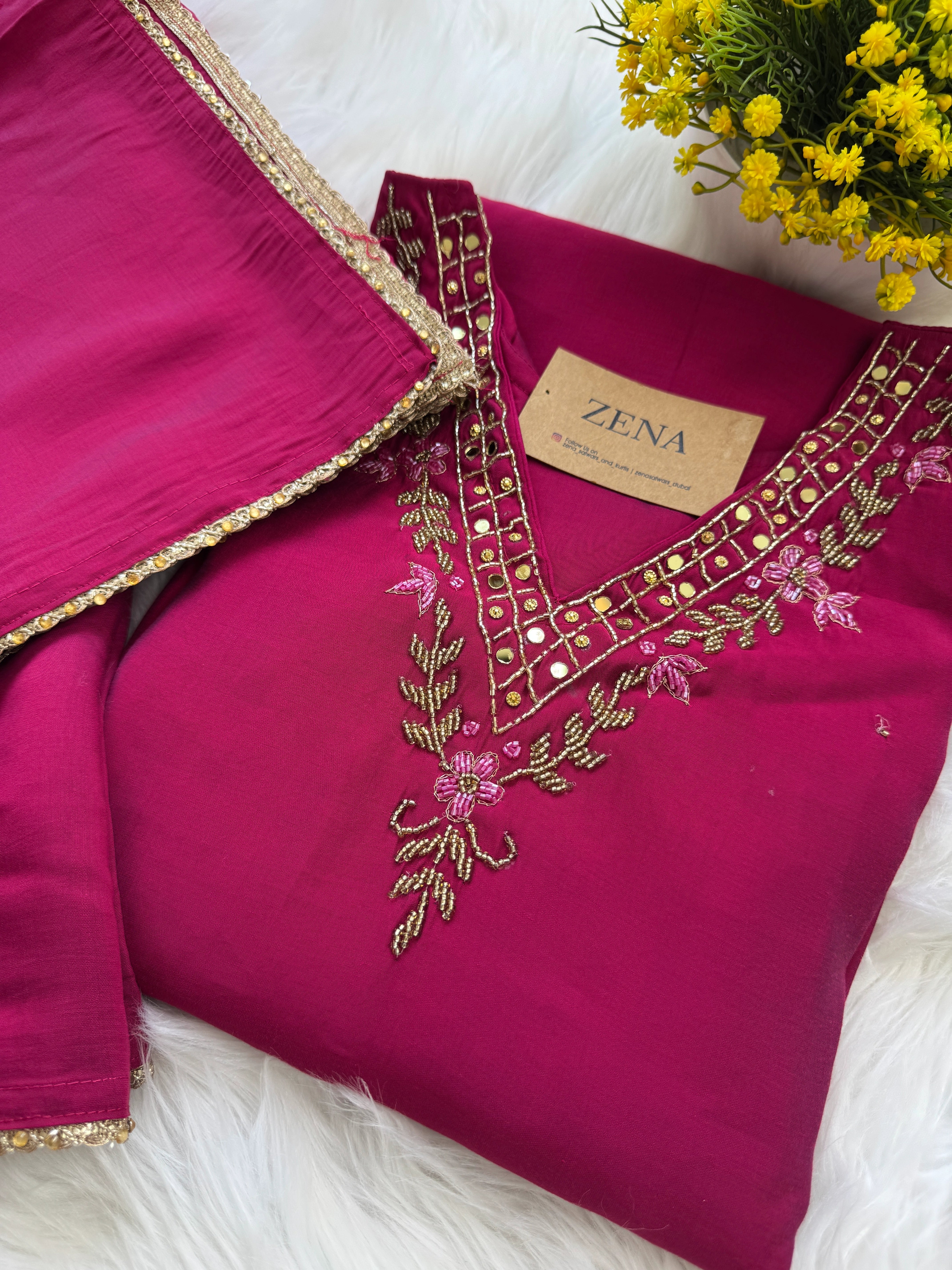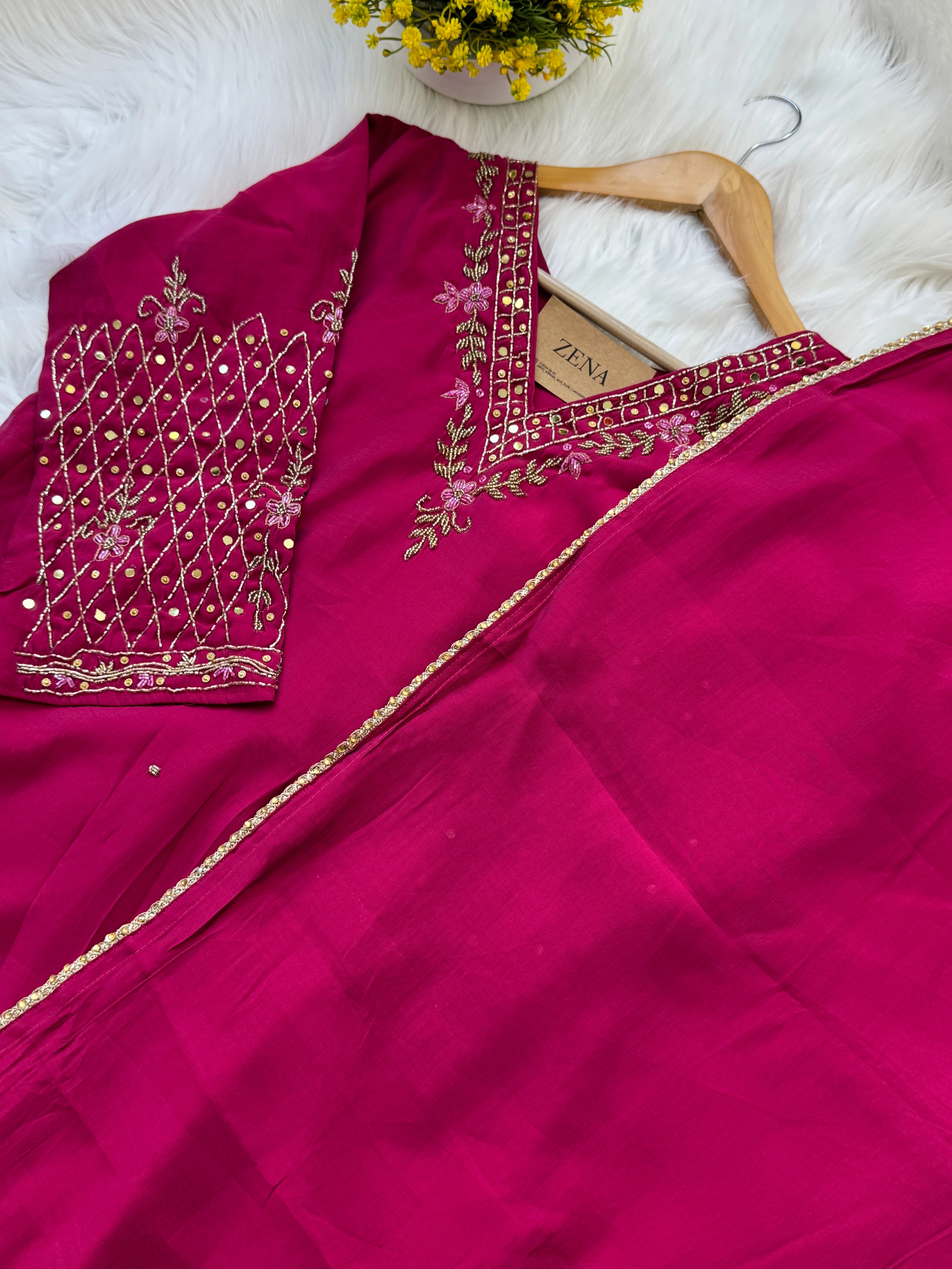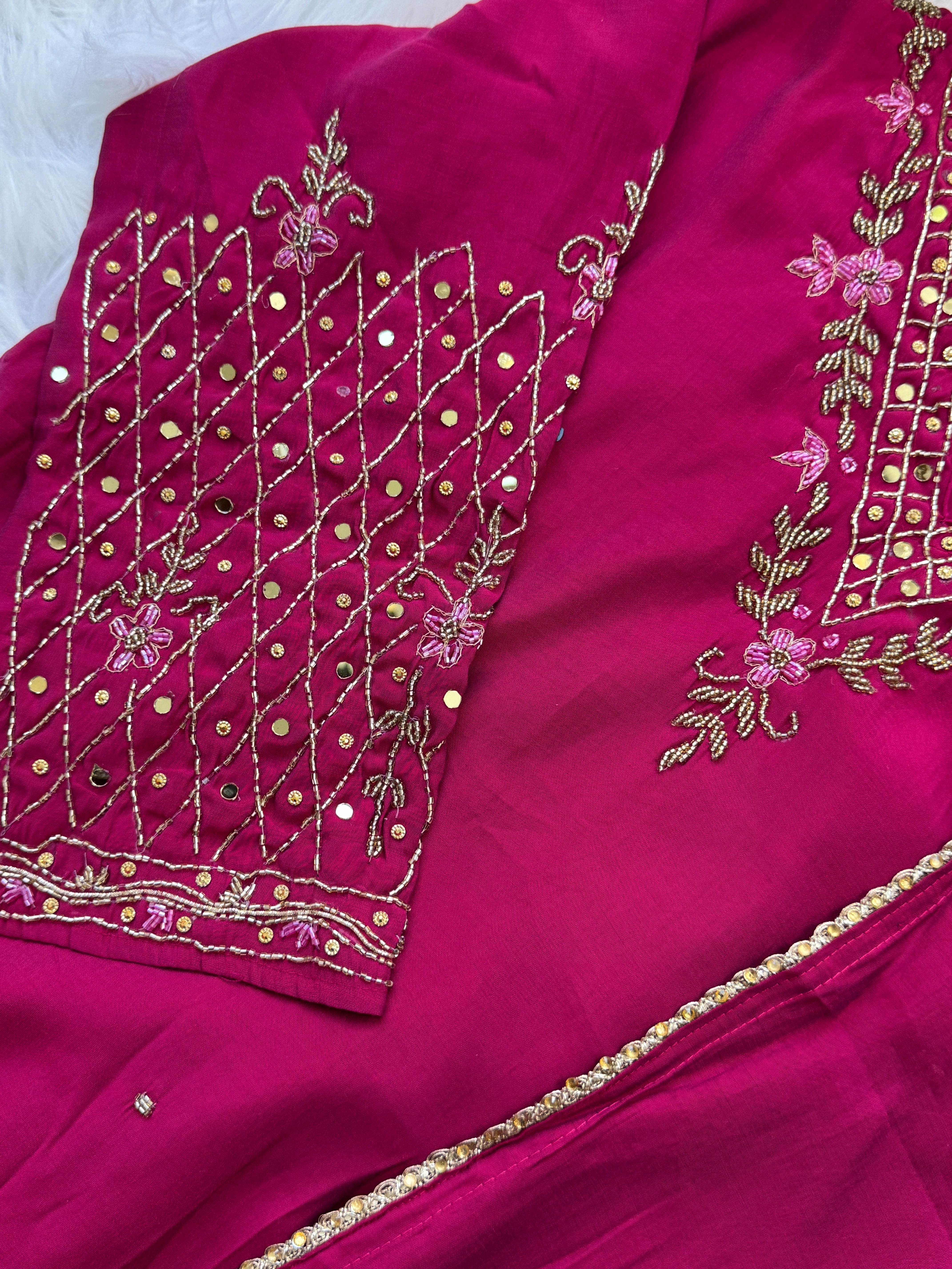 Make a striking impression with this elegant Organza Handwork Party Wear Suit, crafted for women who love classy, festive styles. Made from premium organza fabric, this suit features a soft sheen and an airy, lightweight feel that drapes beautifully.