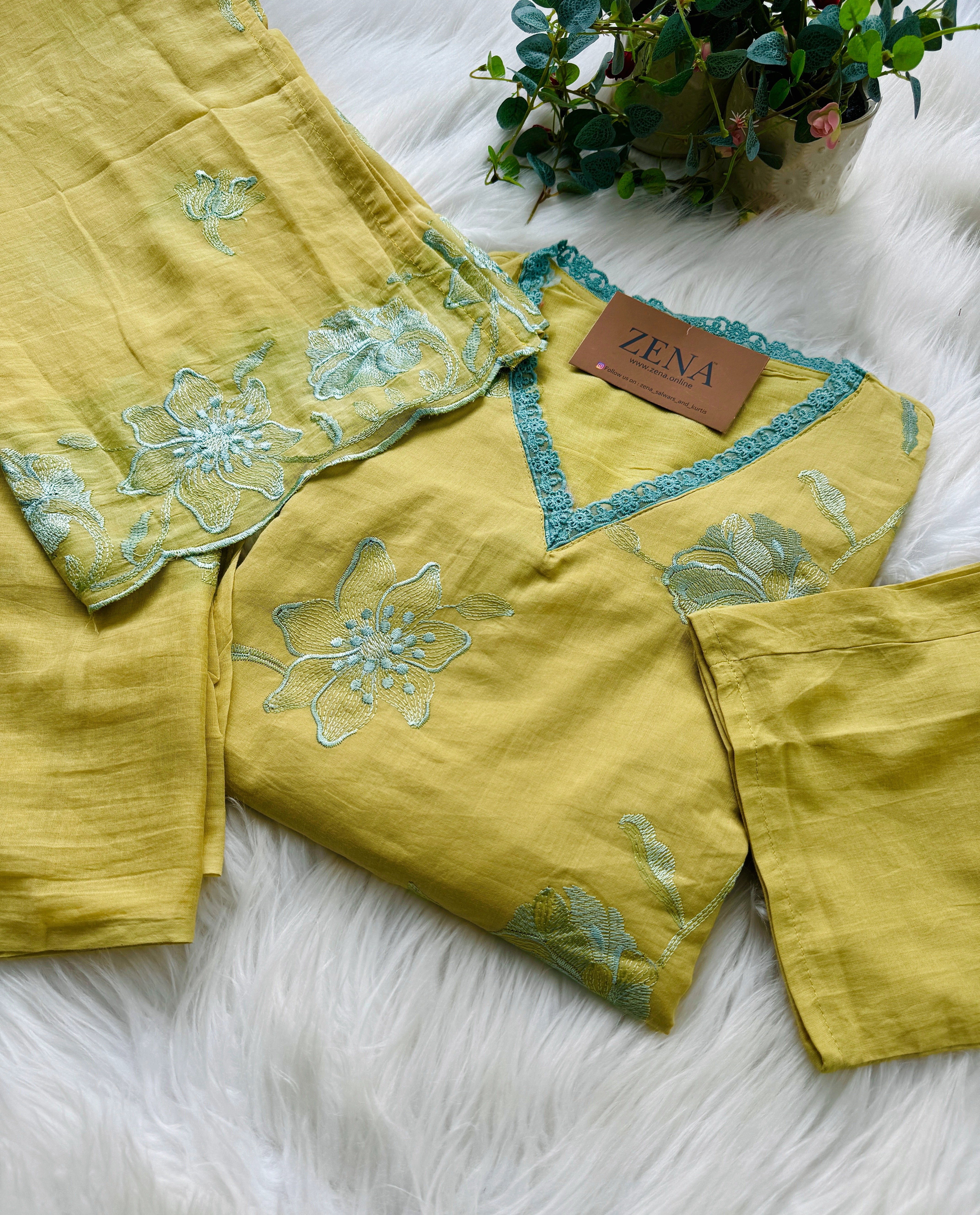 Grace your wardrobe with this Mul Cotton Embroidered Kurti Set, a blend of elegance and comfort. Crafted in lightweight mul chanderi fabric with intricate embroidery, it’s a perfect outfit for festivals, casual gatherings, and office wear. Designed for effortless style, this kurti set offers a timeless ethnic look with a modern edge.