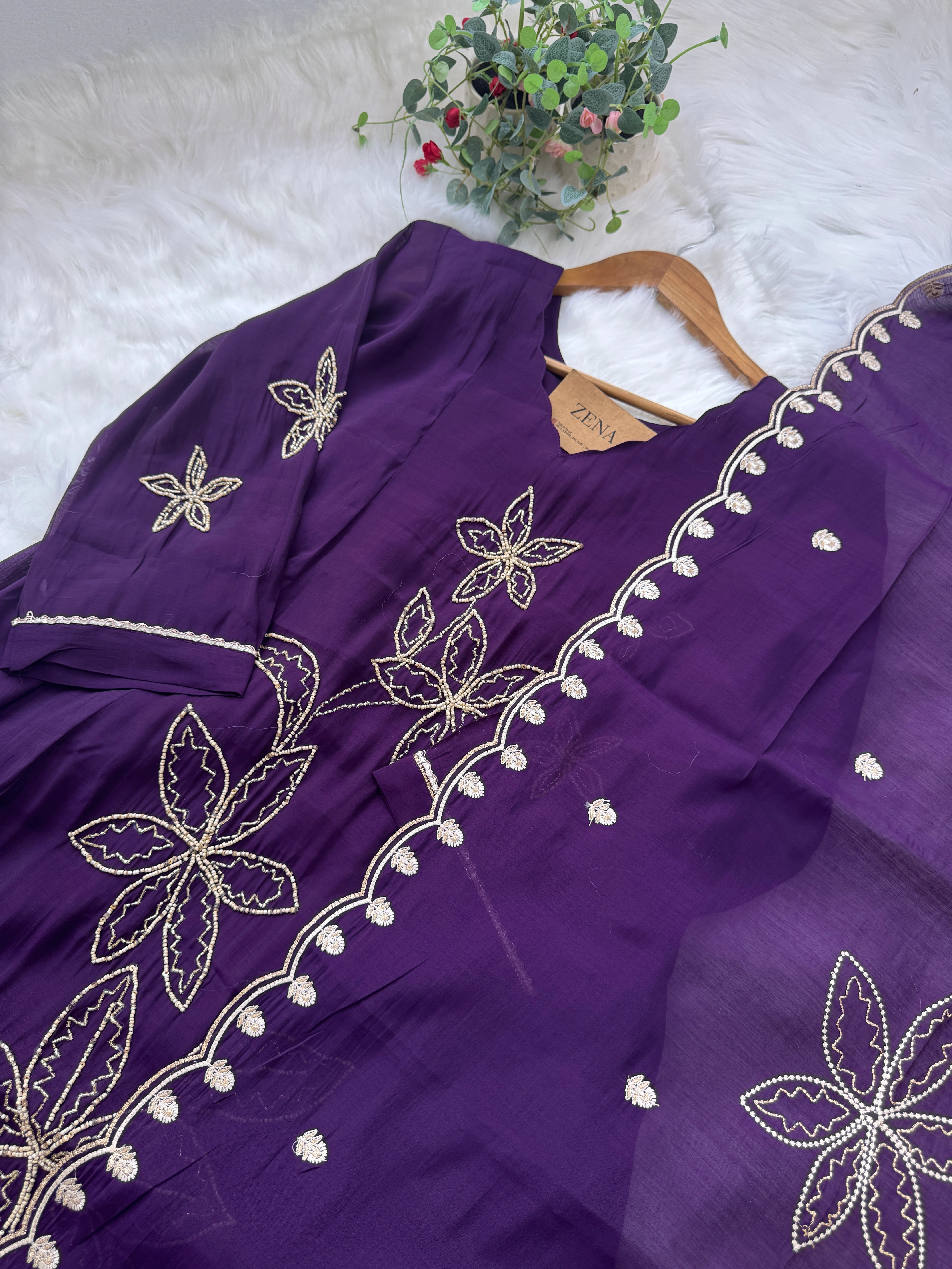 Turn every occasion into a style statement with this stunning Party Wear A-Line Set, crafted in luxurious Roman Silk. The elegant handwork detailing adds a refined festive glow, making this outfit a perfect pick for celebrations where you want to stand out effortlessly.