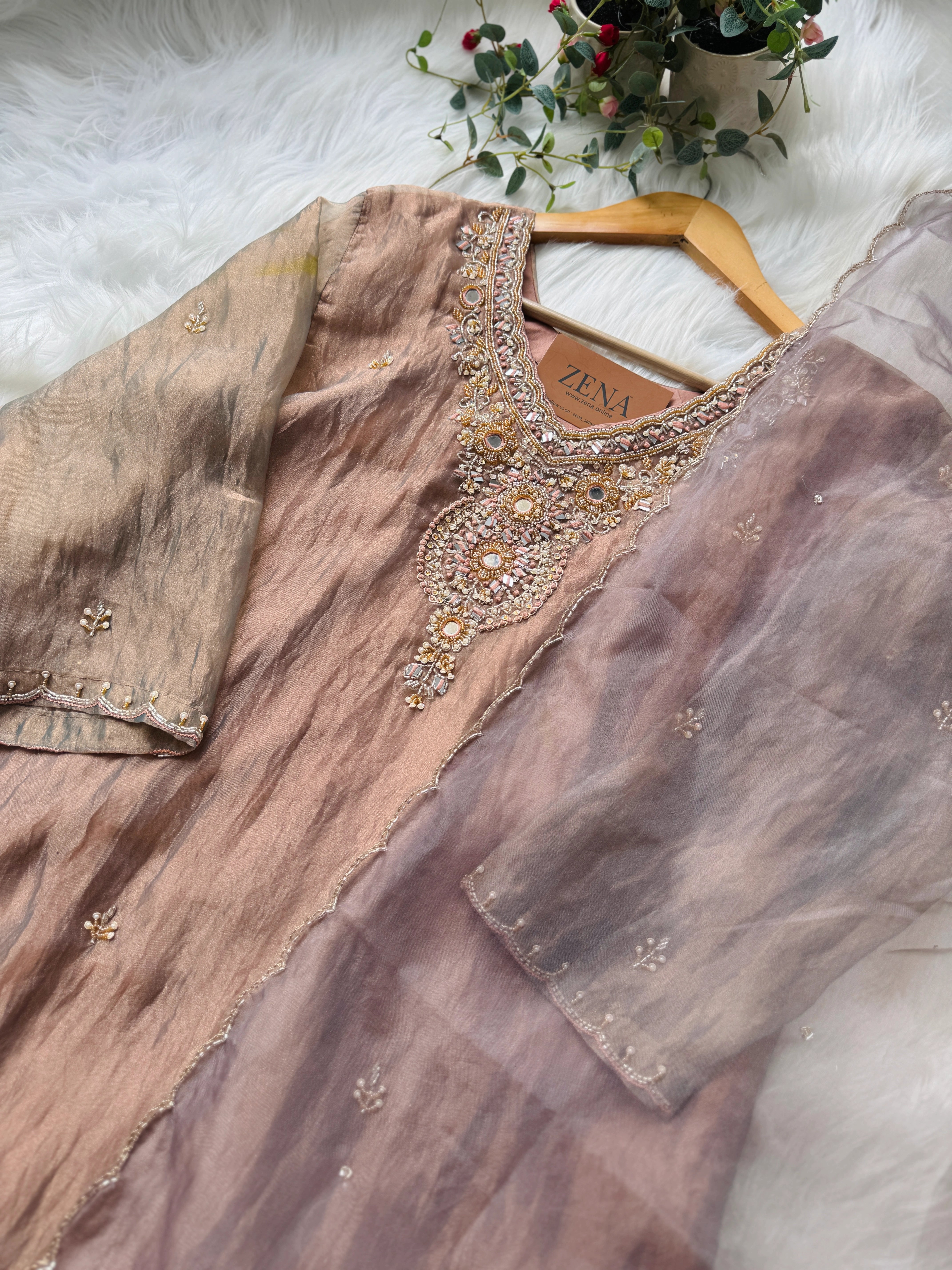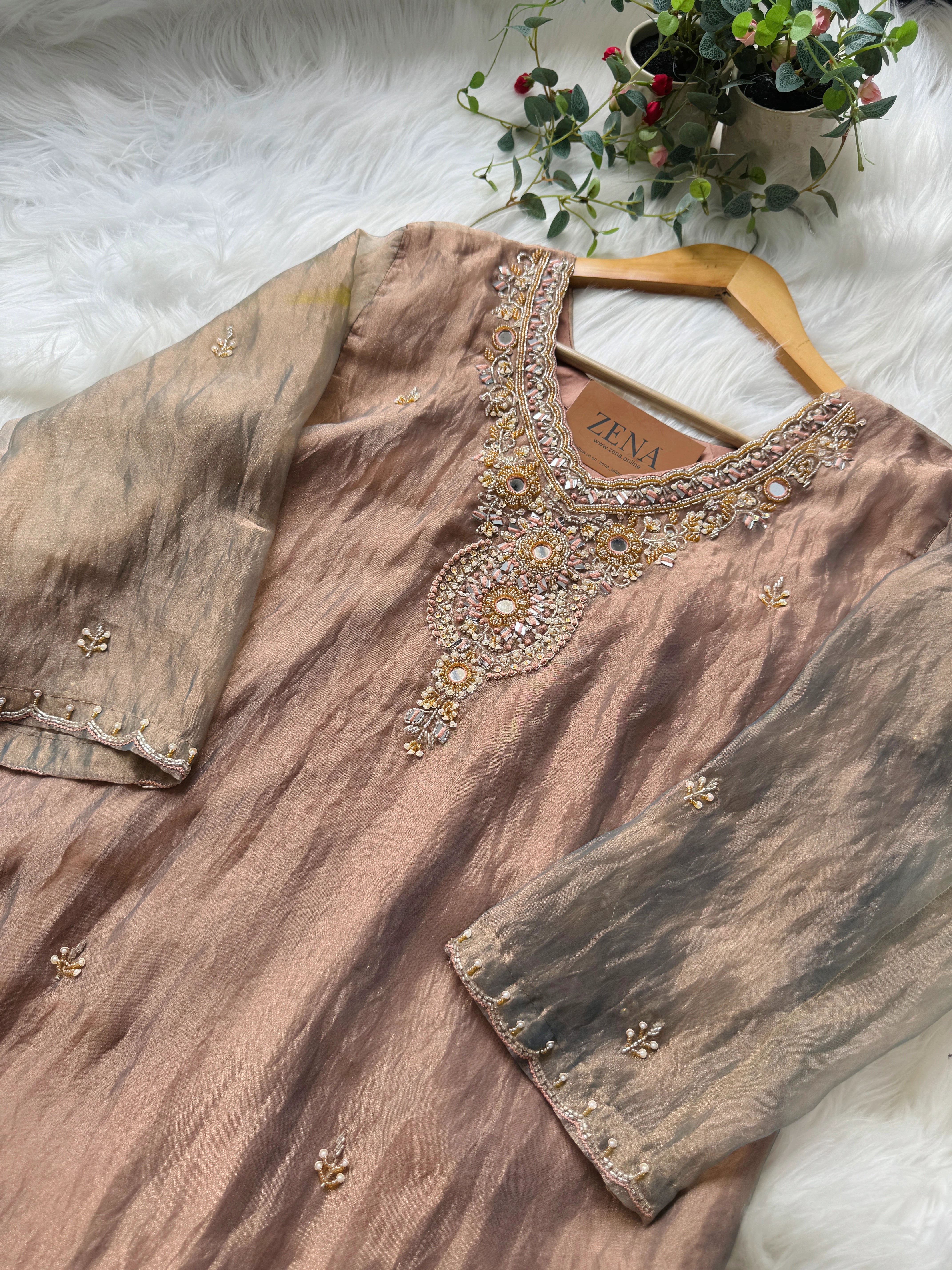 Step into luxury with this Premium Tissue Silk Suit featuring exquisite handwork detailing. Its soft, lustrous fabric and elegant craftsmanship make it a perfect choice for weddings, parties, and festive occasions.