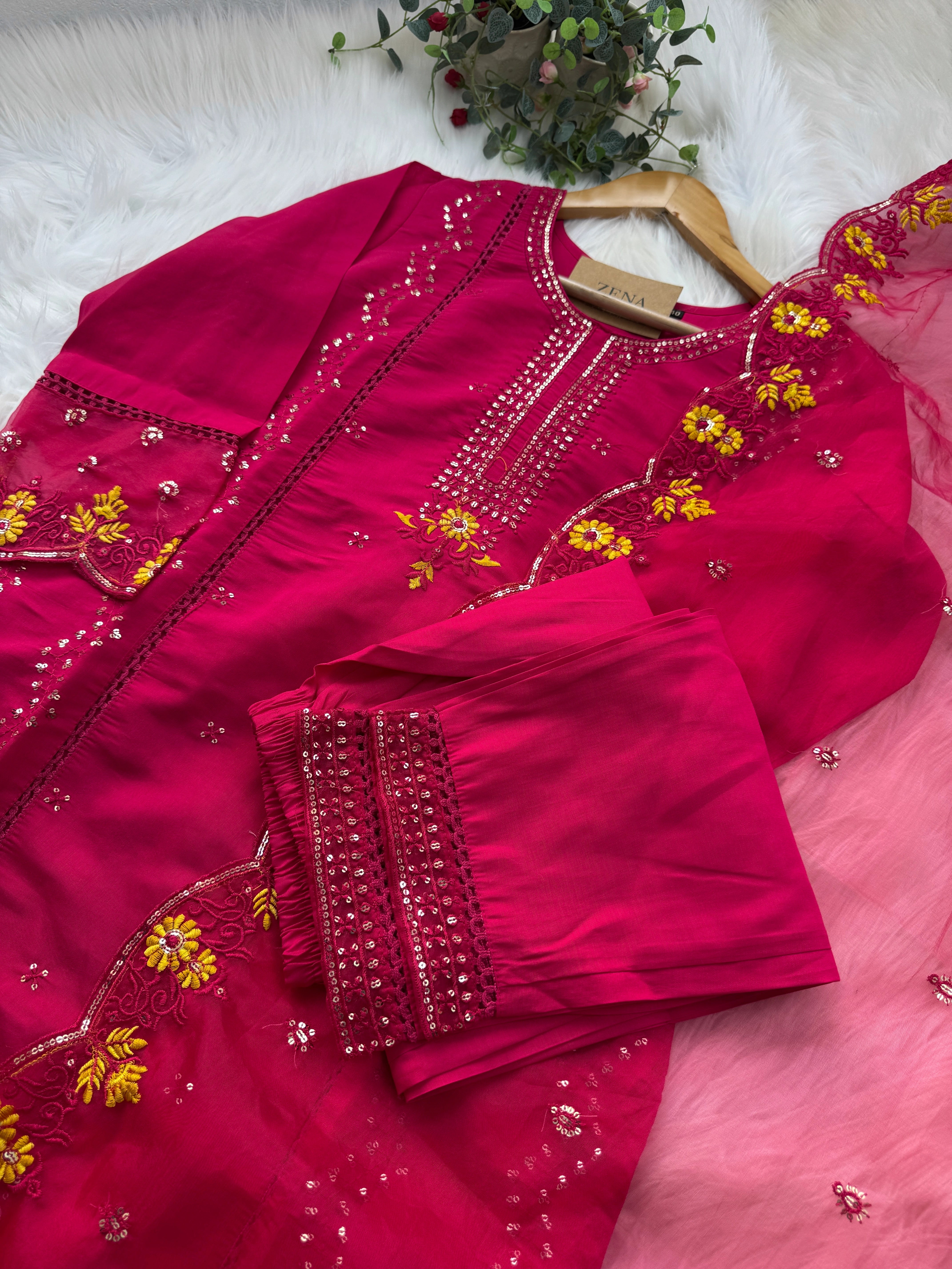 🎀 Set Includes: Kurti, matching bottom & embroidered organza dupatta